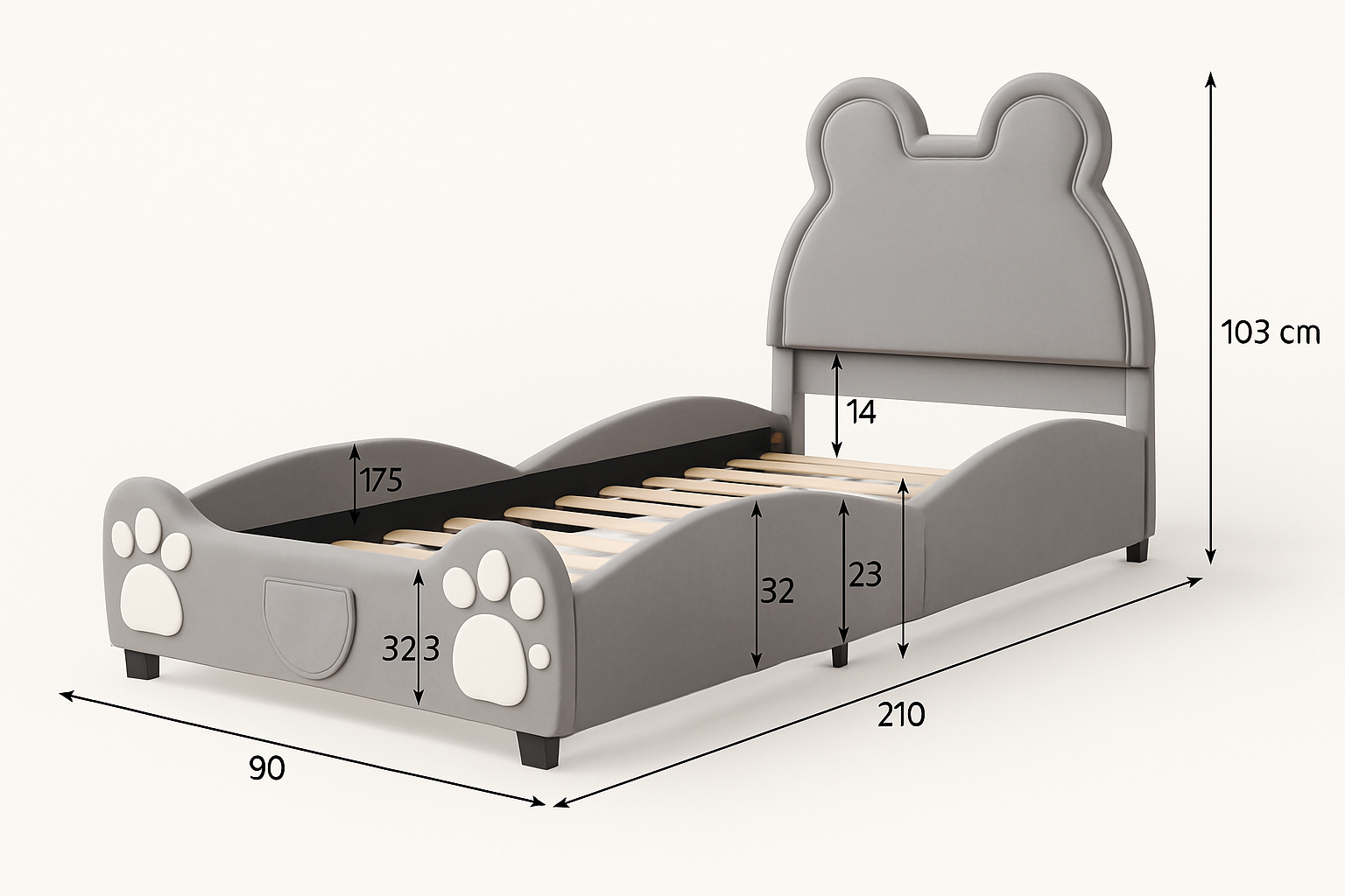 Ce lit enfant ourson gris est le choix idéal pour offrir à votre enfant un espace de sommeil confortable et sécurisé. Avec sa tête de lit en forme d’ourson et ses détails de pattes en relief, il apporte une touche ludique et chaleureuse à la chambre. Son design doux et moderne s’intègre parfaitement dans tout type de décoration, qu’elle soit scandinave, minimaliste ou colorée.